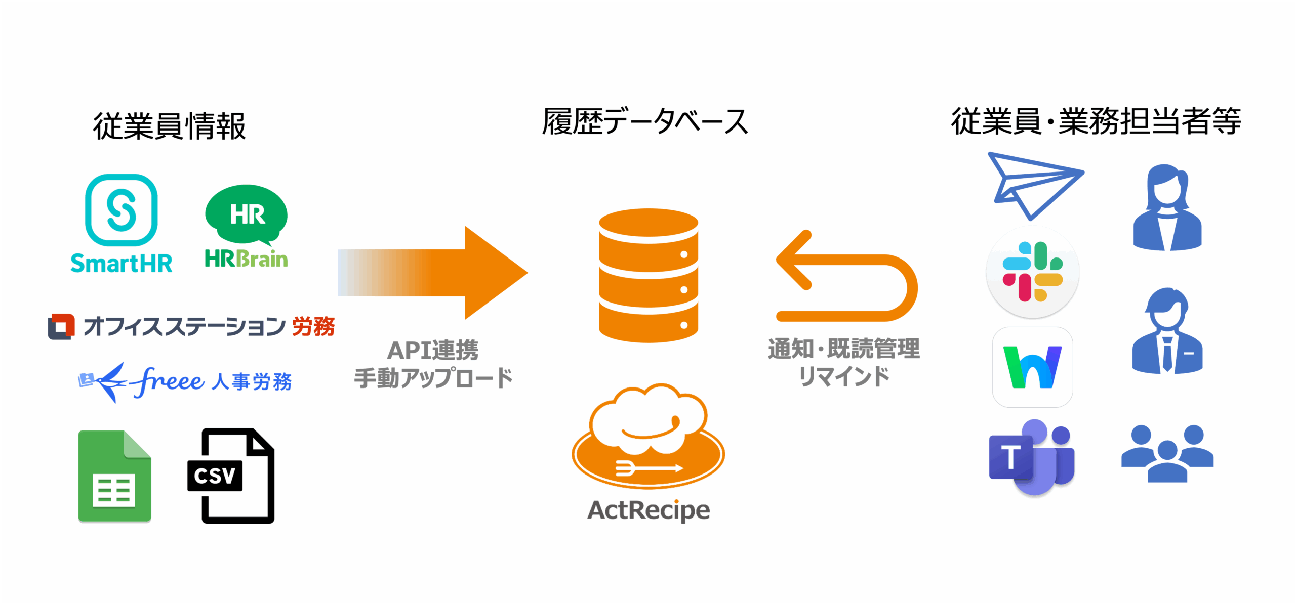 各種HR系SaaSやCSVファイルの従業員情報を参照し、その情報を活用して従業員や上長に自動で通知や催促をします。