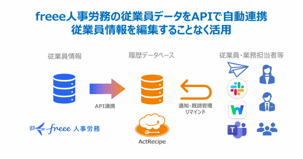 ActRecipeでは、API連携によって得られた知見を活かし、2025年2月よりヘッドレスSaaS(ユーザーインターフェースを持たないソフトウェア)として従業員督促の機能(以下、従業員督促レシピ)をご提供しております。従業員督促レシピでは、HR系SaaSから取得した従業員情報および期日情報から対応が必要なものを抽出し、従業員本人への通知やリマインドを自動化いたします。今般の「freee人事労務」とのAPI連携により、「freee人事労務」からのデータ取得・従業員への通知・リマインドを全て自動化することによって、人事労務ご担当者様等は従業員情報を手動で編集やアップロードをすることなく、セキュアに従業員への督促・催促・各種タスク依頼を行っていただくことができ、業務負担の大幅な削減を実現いたします。ActRecipeの活用によって、タスクの依頼や受領をされる全ての皆さまの「ストレスをなくす」ことに貢献いたします。
