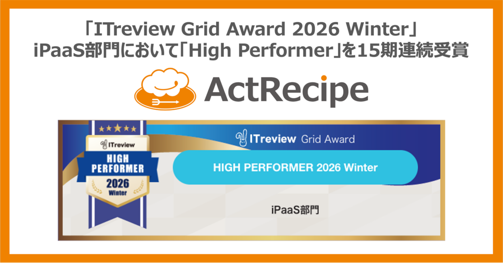 iPaaS「ActRecipe」が「ITreview Grid Award 2026 Winter」において「High Performer」を15期連続受賞