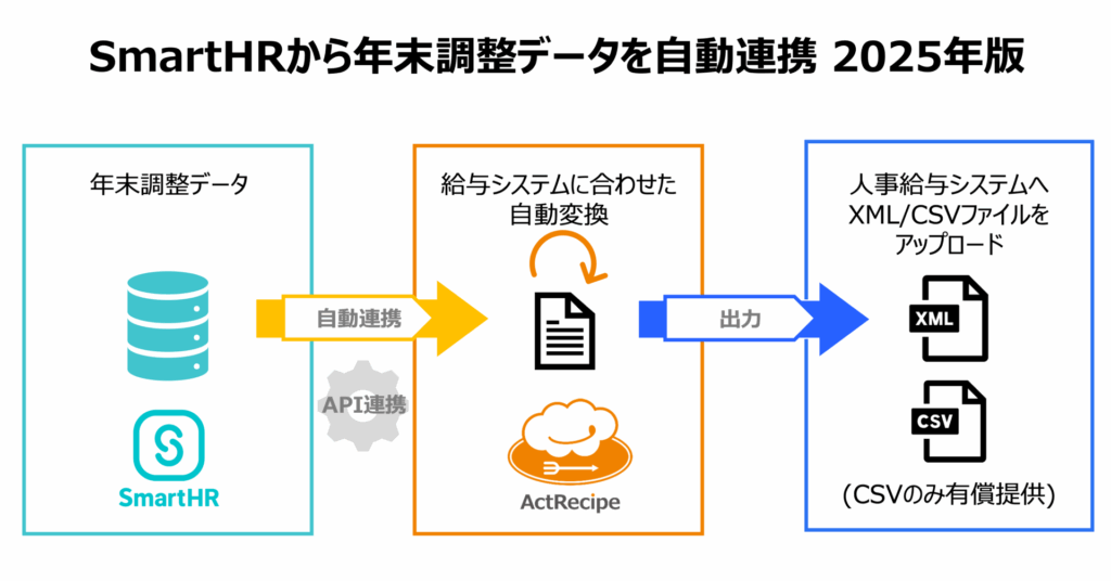 ActRecipeでは、2023年よりSmartHRから年末調整申告書XMLデータを出力する機能を無償で提供してまいりました。2024年版では給与ソフトが個別に求める要件にも対応しており、2025年版ではXMLデータだけでなくCSVファイルでの出力にも対応してまいります。